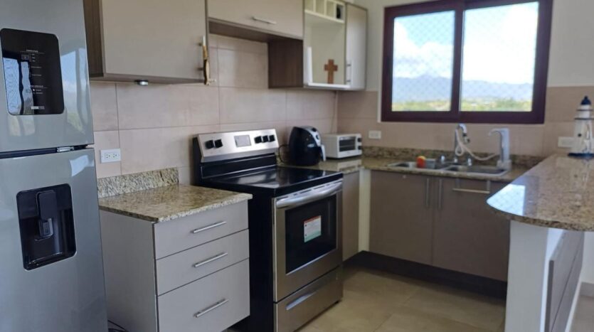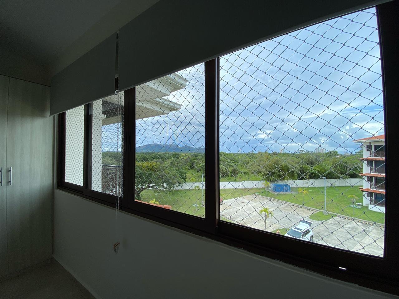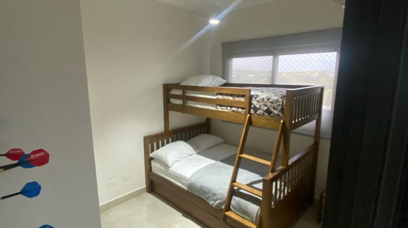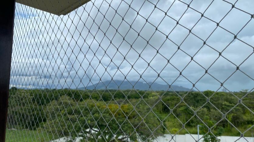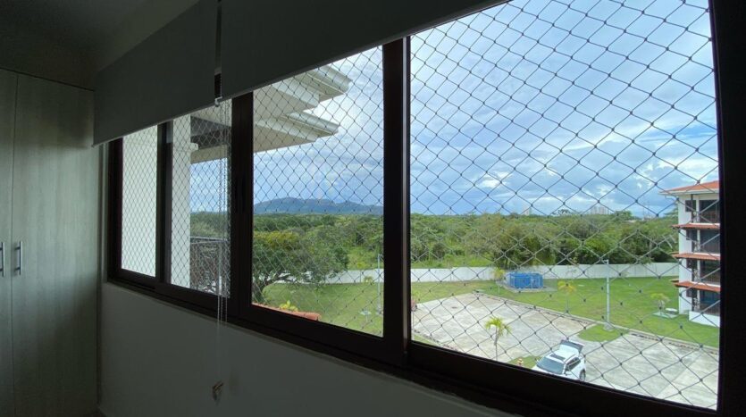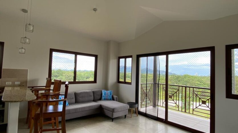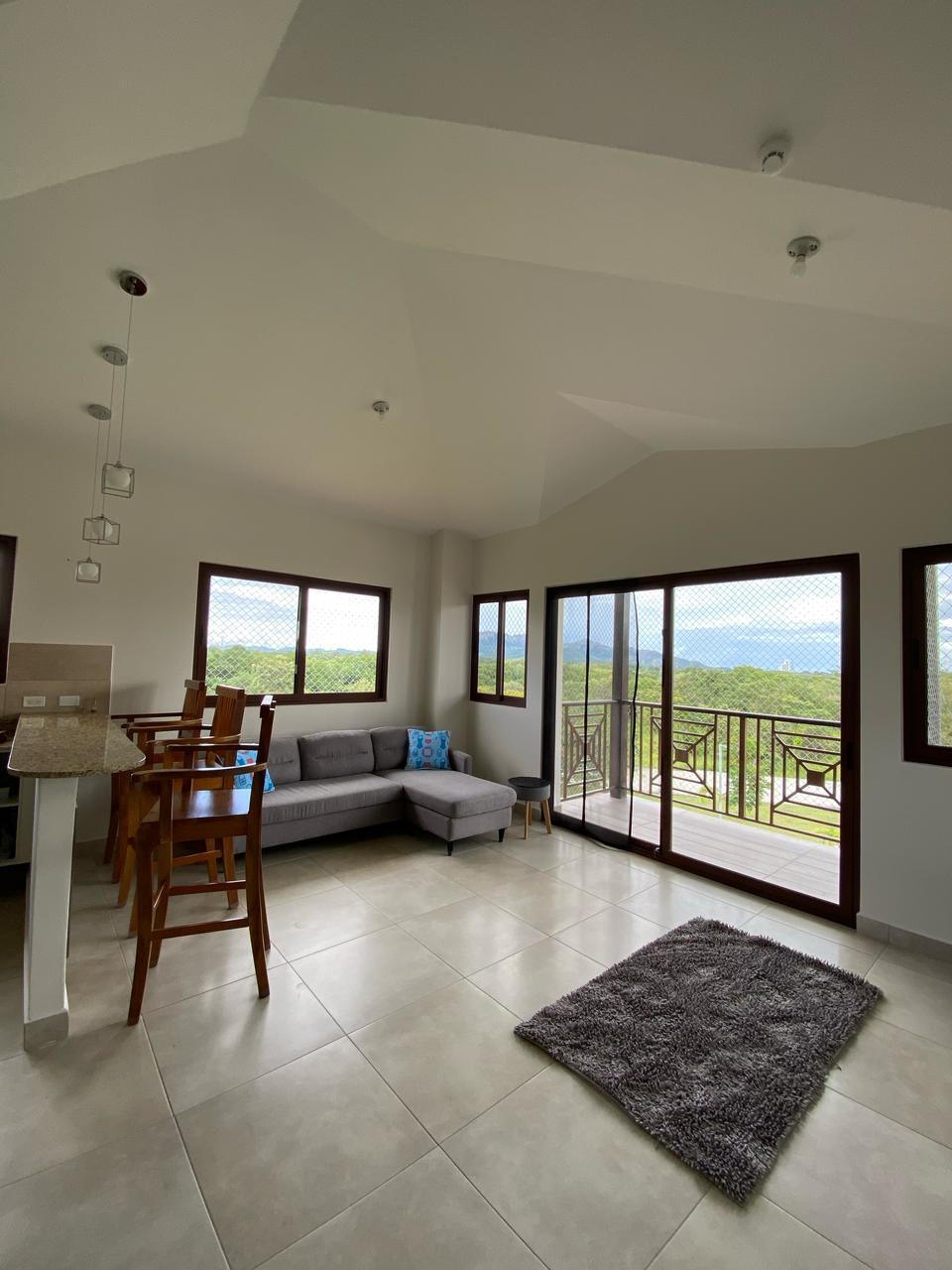 Apartamento con vistas a la montaña, decoración minimalista. La ubicación de ventanas y puertas permiten el aire cruzado, por lo que es un apartamento fresco. De aquí procede el nombre de la torre, Alisios.