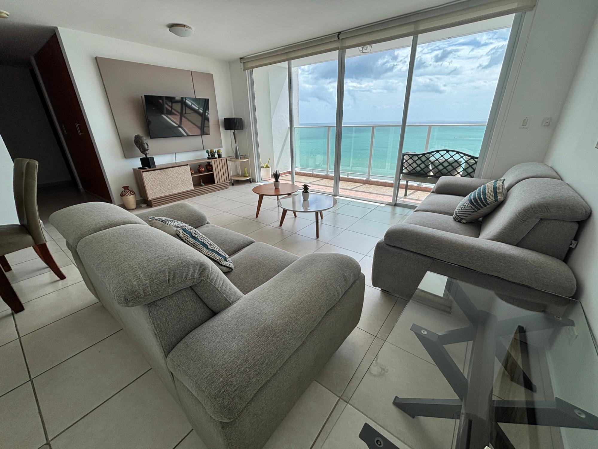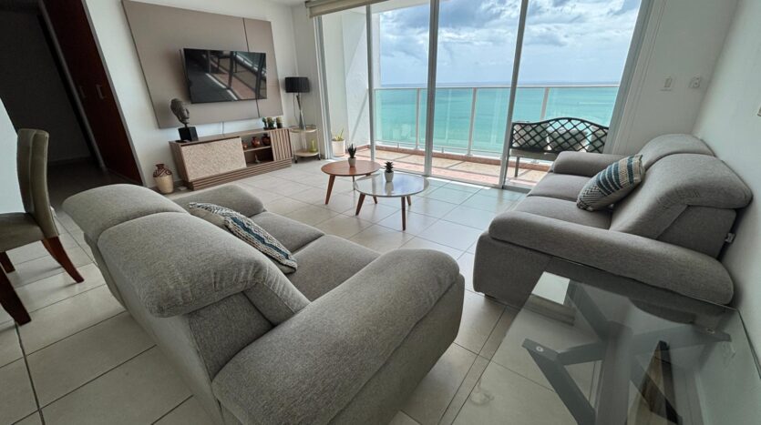 Cómodo apartamento totalmente amoblado y listo para ocupar en el edificio Terramar, torre 1000. Cuenta con tres recámaras, dos baños e increíble vistas al mar y a la ciudad. Terramar es un complejo de edificios de primera fila frente al mar. Su área social es amplia y cuenta con sala de fiesta, piscina y gimnasio. Adicionalmente tiene planta eléctrica, seguridad 24 horas, garita de acceso, estacionamientos de visita y tres elevadores. No dude en contactarnos para conocerlo.