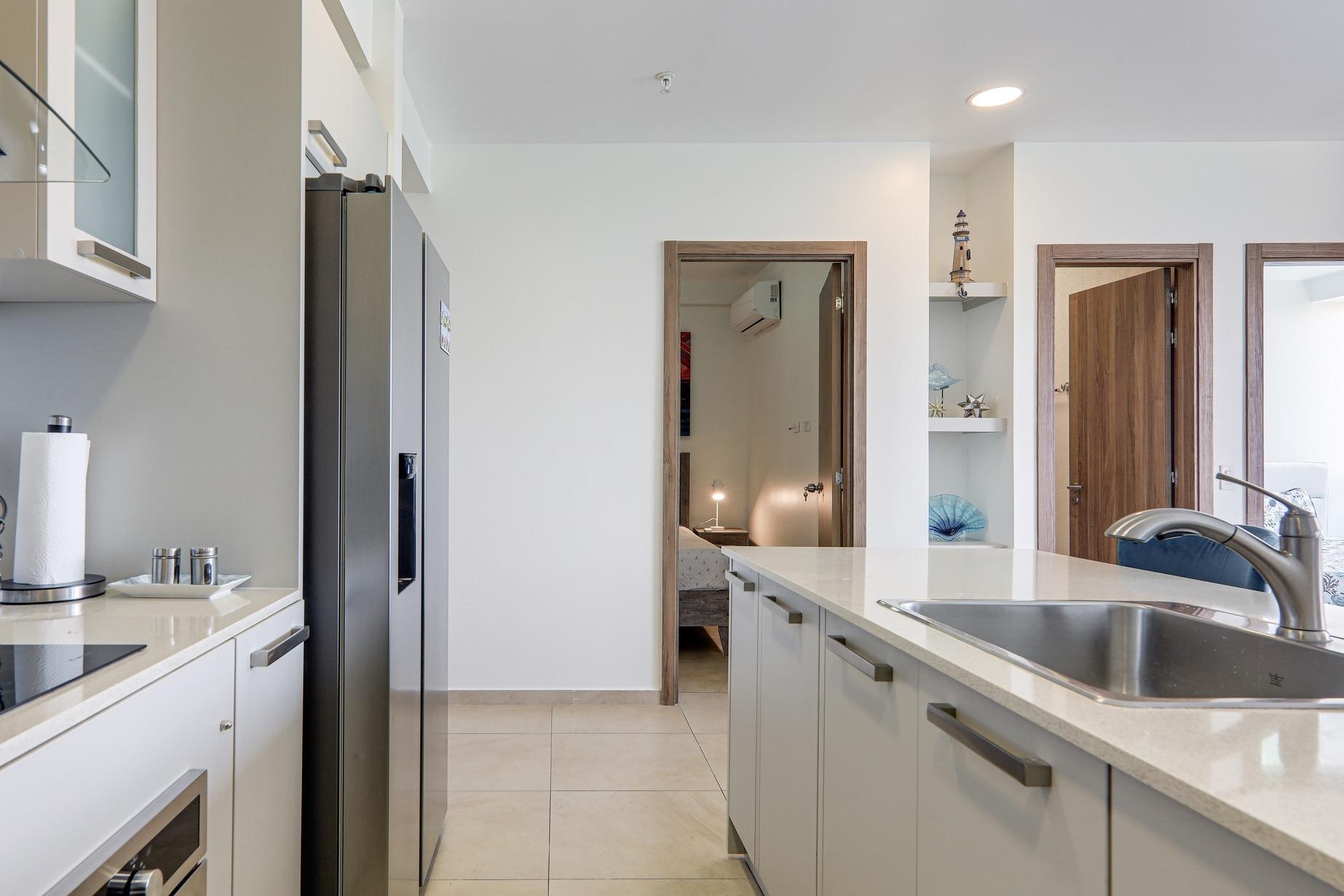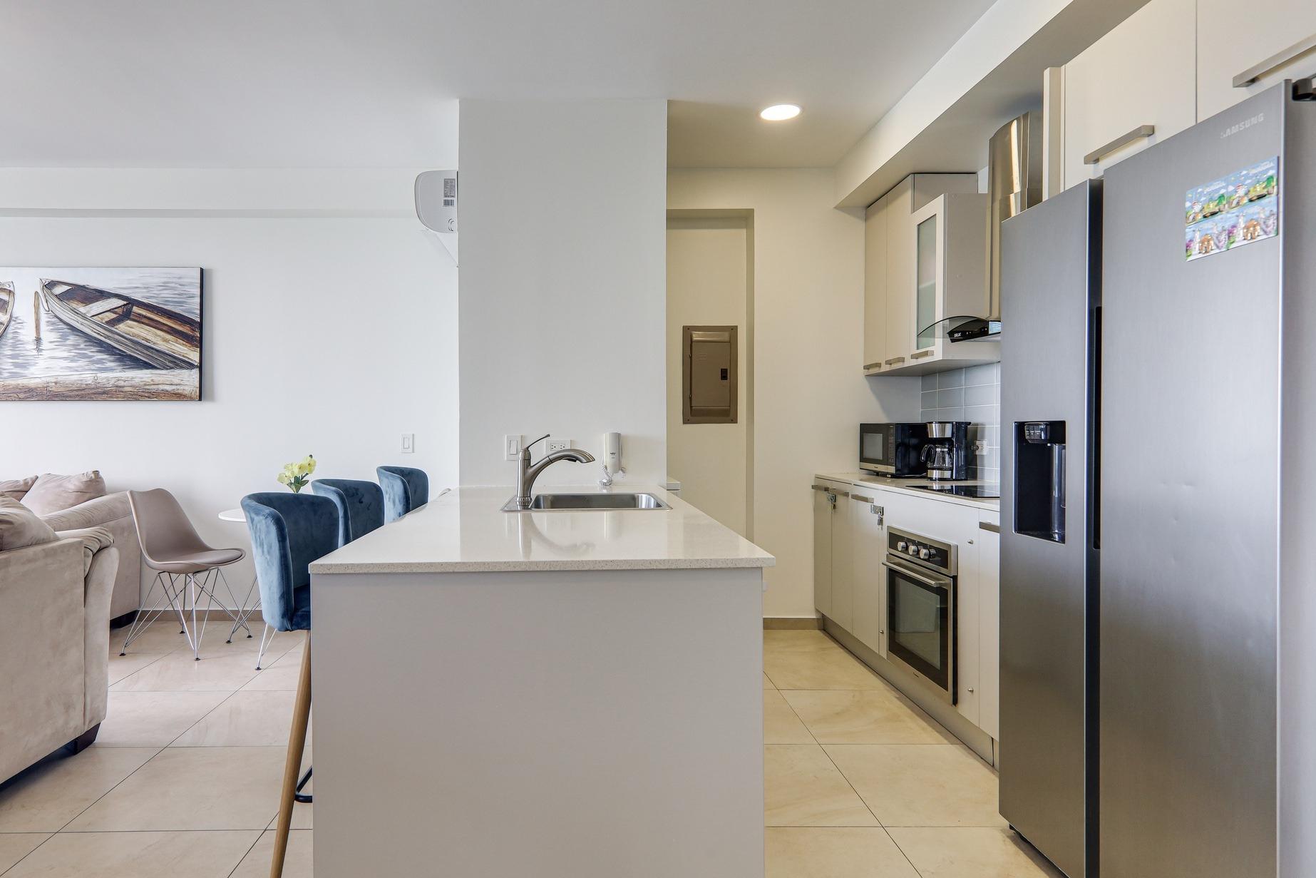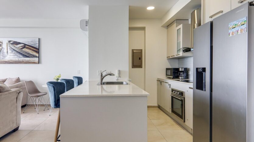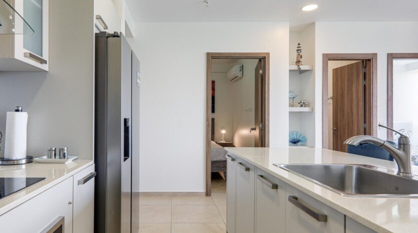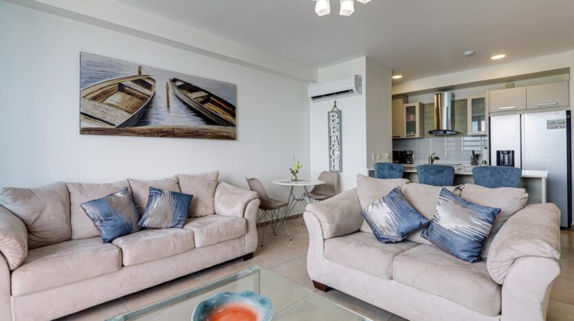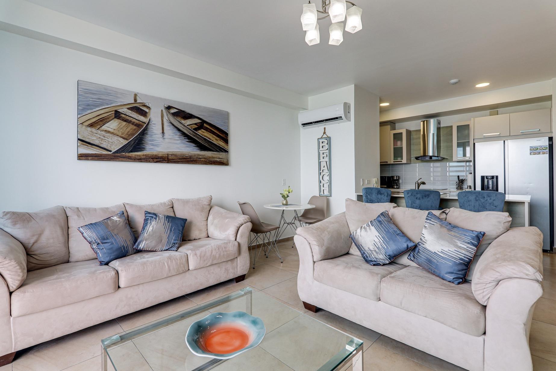 Las características de este apartamento incluyen: 70 m2 de construcción Impresionantes vistas hacia la tranquila caleta de pescadores y el Océano Pacífico desde la sala-comedor y recámara principal Balcón con paneles de vidrio Cocina abierta con línea blanca de acero inoxidable Recámara principal con cama king Segunda recámara con cama queen Baño externo completo Lavandería privada con calentador de agua a demanda Un estacionamiento asignado Cuota de mantenimiento muy baja, de solo $140/mes e incluye agua y aseo