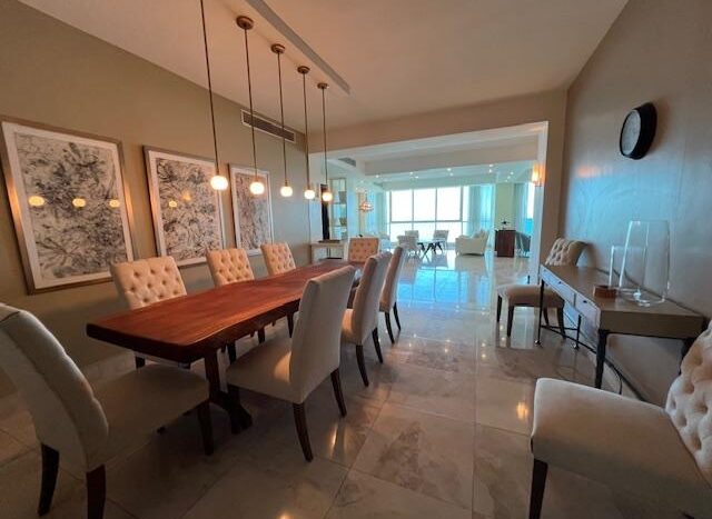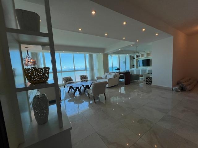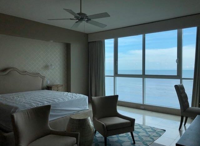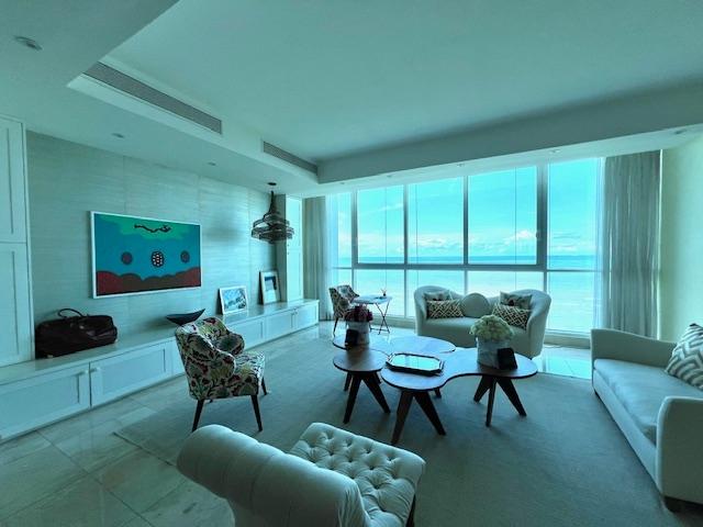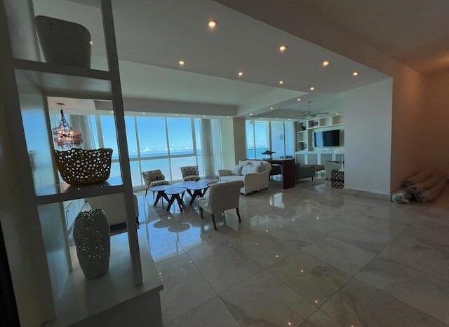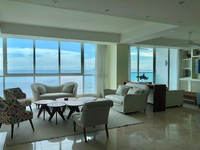 Lujoso apartamento finamente amoblado en alquiler, primera linea frente al mar con espectacular vista, planta 385 m2 con distribución óptima, amplia sala y comedor, den, balcón, sala familiar, 4 recamaras con sus baños, con walk in closet, piso de mármol, amplia cocina con área para desayunador, lavandería, c/b/e, estacionamiento para 3 autos,área social completa, piscina con tobogan, salón de fiesta, área de juegos para los niños y adolescentes, salones de fiesta, canchas de futbol, basketball, squash, racquetball, sauna, baño de vapor, bohios, y gimnasio equipado con equipo de primera, elevadores de alta velocitad. Edificio de 67 pisos, área social tipo resort, la más amplia y lujosa de Costa del Este. Edificio super exclusivo, torre totalmente residencial más alta de panamá con solo 90 apartamentos. Ave. paseo del Mar, Costa del Este