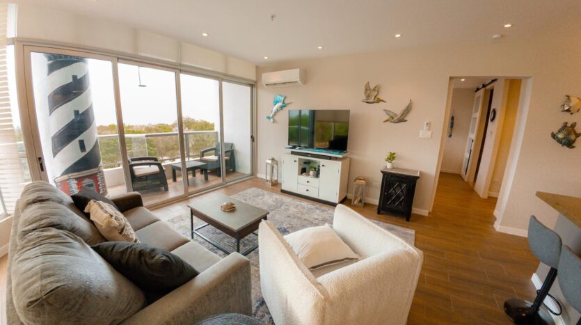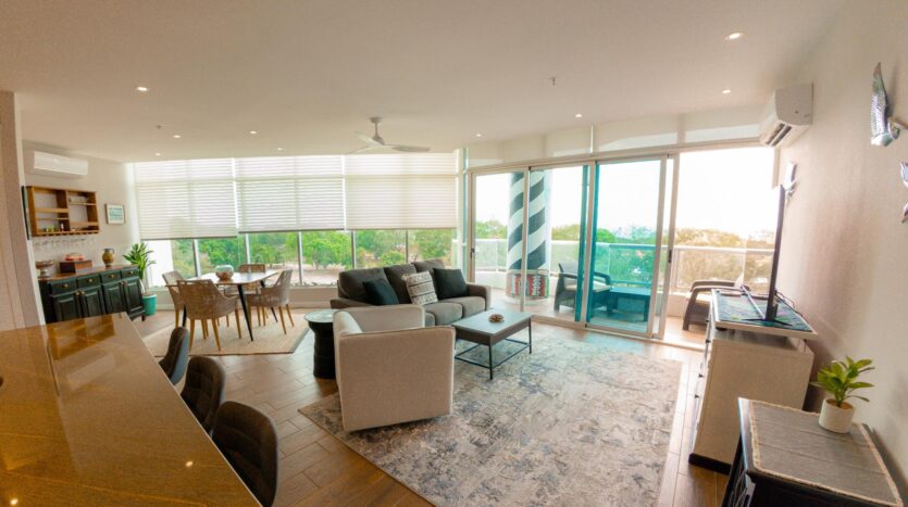 Ubicada en el octavo piso, esta elegante residencia de un dormitorio ofrece una excepcional sensación de privacidad y altura, con vistas panorámicas al campo de golf. Diseñada para una vida interior-exterior sin esfuerzo, la vivienda cuenta con dos balcones privados: uno que se extiende desde la sala de estar principal y otro desde el dormitorio, creando dos espacios distintos para relajarse, recibir invitados o disfrutar del entorno costero. Las líneas arquitectónicas depuradas, los ventanales de piso a techo y una distribución cuidadosamente diseñada de 110 m² le otorgan al espacio una luminosidad y modernidad excepcionales, mientras que la espaciosa suite principal, con su propio balcón y baño privado, ofrece una experiencia tranquila y relajante.