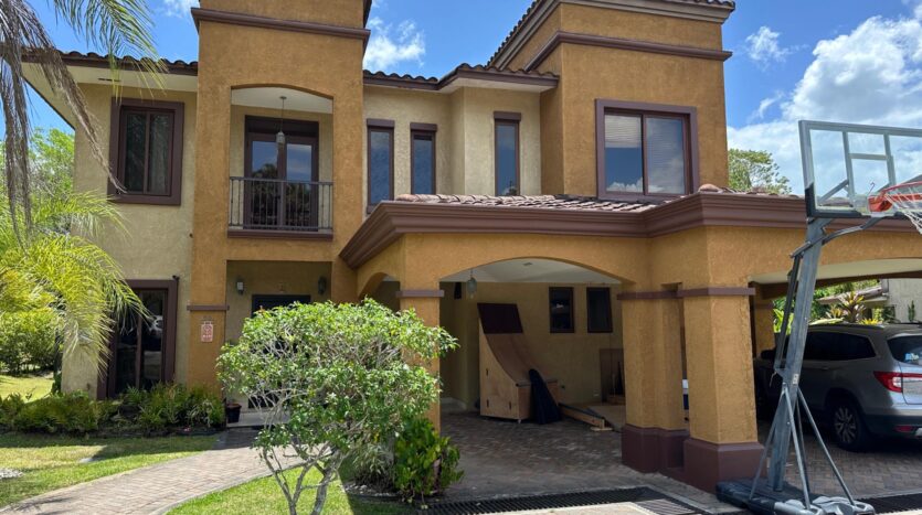 Casa Ubicada en PH Embassy Club, Forest State 458 m2 const. 774 m2 de terreno 4 recámaras con baño Recámara principal con jacuzzi y walkincloset ½ baño de visita Den cerrado Family room Terraza Techada Amplio Salón Comedor Depósito 3 parking techados (capacidad para 6 autos) Cuarto y Baño de empleada Amplia lavandería techada y cerrada Cocina cerrada con desayunador y salida directa al jardín y terraza Amplio jardín, más grande que el promedio Pisos de cerámica importada Balcón con linda vista 4 aires centrales Estufa, Neveras gemelas, extractor, lavaplatos automático, lavadora smart , secadora, triturador de desechos y calentador de agua Condominio 463$ (no incluye servicios de gas, agua y aseo) Año de construcción 2009, exoneración hasta 2029 } PH Ubicado en Clayton muy cerca del Canal de Panamá y Ciudad del Saber, con amenidades recreativas como: Casa Club con café restaurante, Gimnasio, Canchas de tenis, futbol y basquet, Piscinas, parque infantil, gazebos, Salones de Eventos y Seguridad 24/7. Se vende en 1.050.000$ (2300$/m2) Se alquila en 4950$ Para citas llamar a Grace Valero