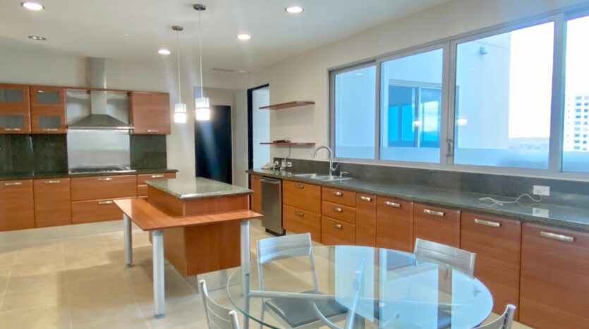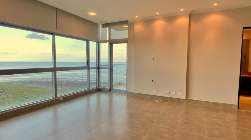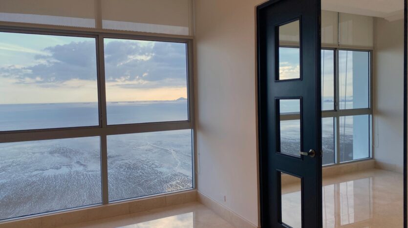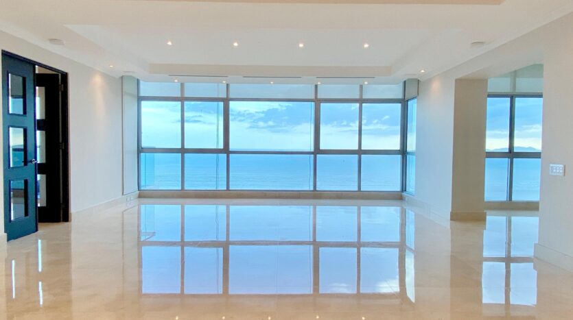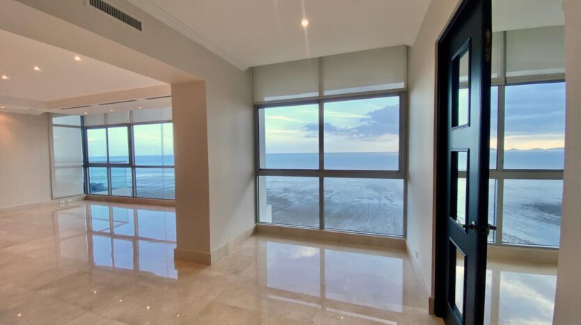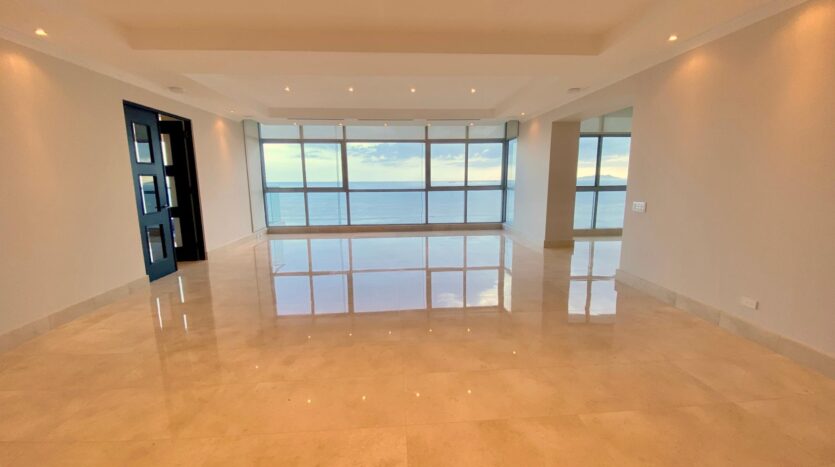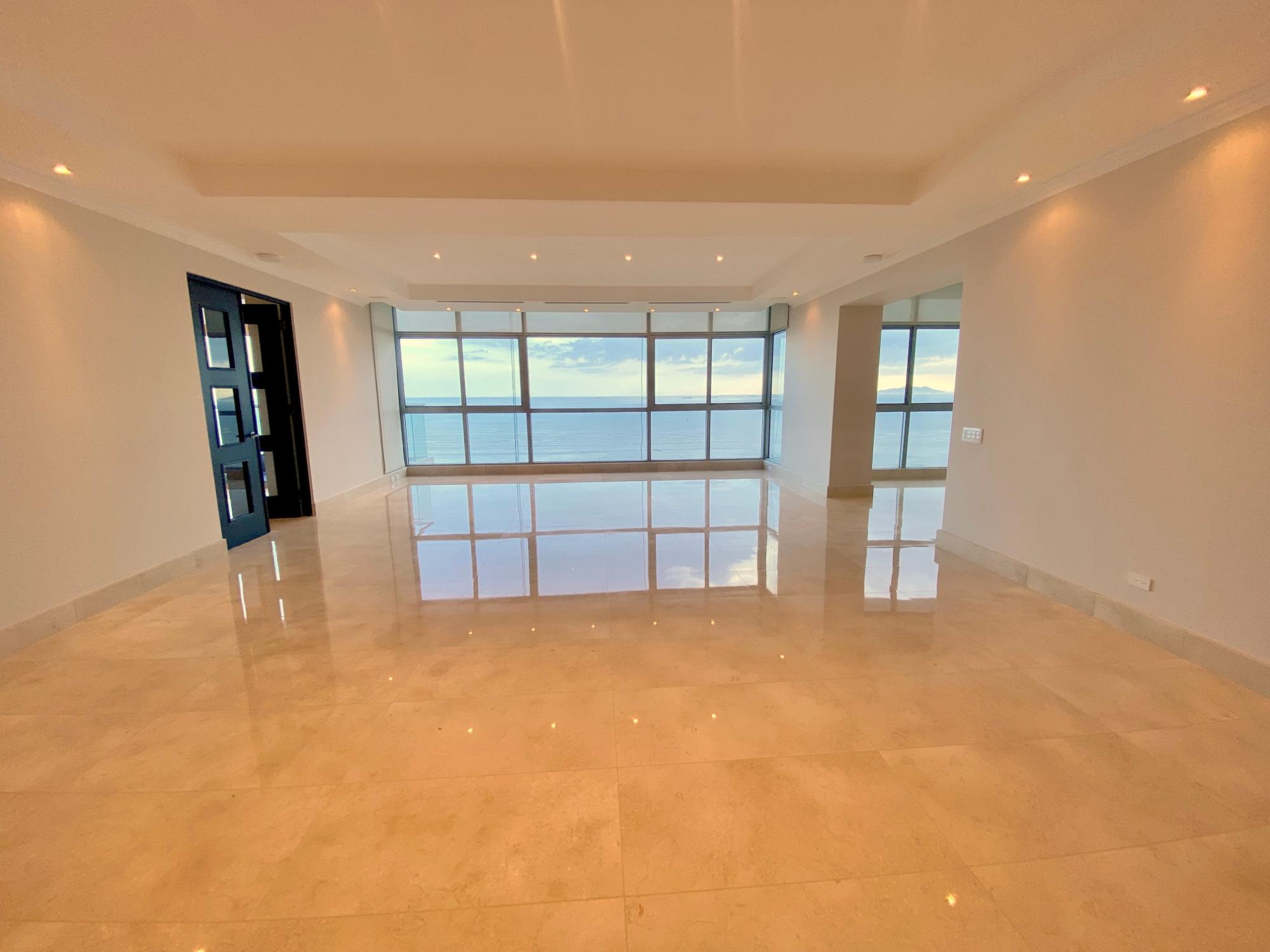 Hermoso apartamento con vistas frente al mar y hacia la ciudad, cuenta con 420m2, 3 recamaras, 3 baños completos, hall de entrada, sala, comedor, Oficina, Den con 1/2 baño, Family room, Cuarto y baño de empleada, Lavandería con muebles, Lavadora y Secadora a estrenar, Depósito: grande, 3 estacionamientos, balcón con vistas. – Sistema Inteligente integrado: WiFi, Iluminación, Sonido, A/C, y Persianas de área social y hab principal. Alarma -Línea blanca: lavaplatos nevera vino ,neveras gemelas columna horno-microondas, estufa , tiene corriente en la cocina 110/220. -Tipo de aires central: área social y dormitorios. -Tipo de aire Split: en Den, Oficina y Cocina El Edificio cuenta con Salón de Fiestas, Piscina, Gym, Parque Infantil, canchas de Paddle,área de bbq y otras amenidades/ servicios