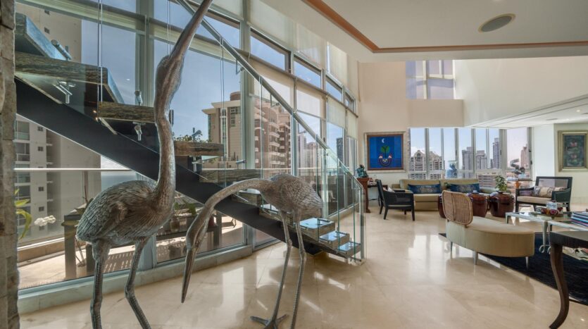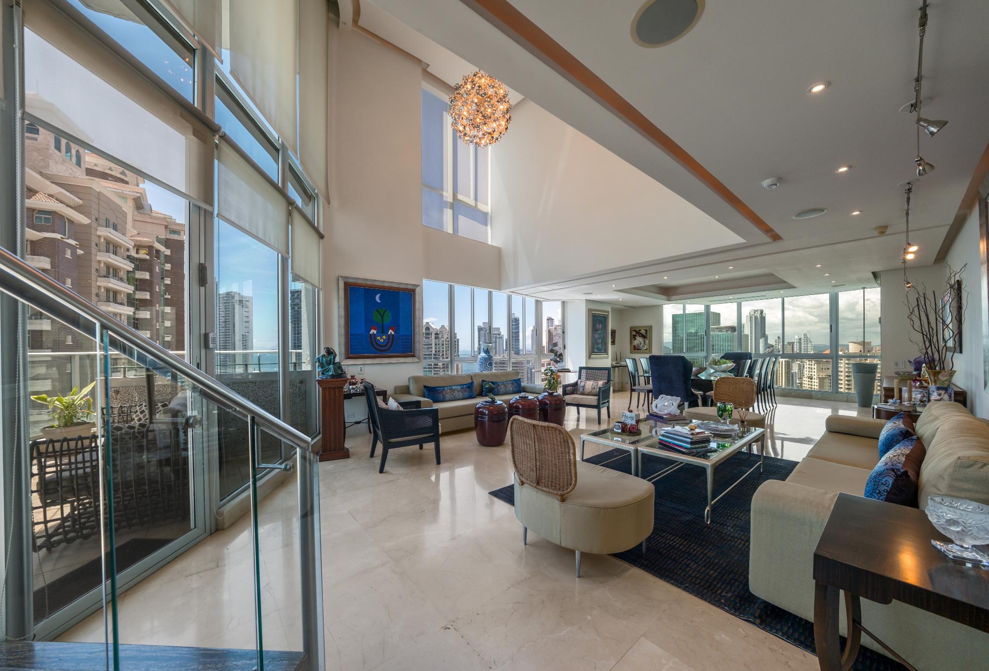 El Skyline Penthouse en Blue Bahía es un penthouse dúplex en Punta Pacífica, uno de los barrios más consolidados frente al mar de la Ciudad de Panamá. Desde su posición elevada, enmarca vistas abiertas del Pacífico y el horizonte de la ciudad, equilibrando la privacidad con el acceso inmediato a la ciudad. La residencia se distribuye en dos niveles, separando las áreas de entretenimiento de los dormitorios con claridad y propósito. La luz y la perspectiva definen la experiencia en todo momento. El nivel social principal se define por un impresionante volumen de doble altura y ventanales de piso a techo. La sala de estar es el verdadero punto de conexión, conectando el comedor directamente con el balcón en un flujo continuo. Al salir, el balcón extiende el espacio social al aire libre, manteniendo las vistas al océano y al horizonte presentes en todo momento. La cocina es espaciosa y práctica, diseñada para la vida diaria y para recibir invitados informales. Dos salas familiares independientes aportan versatilidad. Una está orientada al uso diario de la familia e incluye un área de escritorio integrada. La segunda está concebida como una sala de estar más privada para adultos y cuenta con un bar integrado para reuniones íntimas. En la planta superior, la planta privada incluye tres dormitorios secundarios, cada uno con baño y armario, además de un espacio adicional entre habitaciones para una sala de estar. La suite principal ofrece acceso directo a un balcón privado con vistas despejadas, además de vestidor y baño en suite. Diseñada para quienes valoran el espacio, la tranquilidad y una ubicación privilegiada. Contáctenos para programar una visita privada.